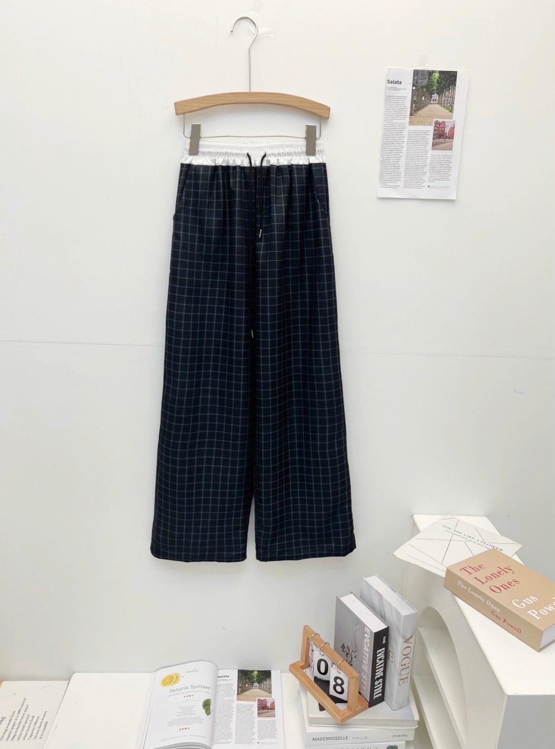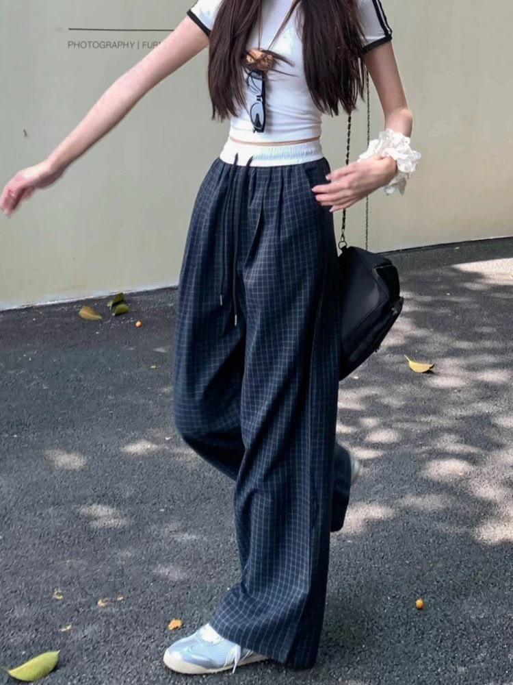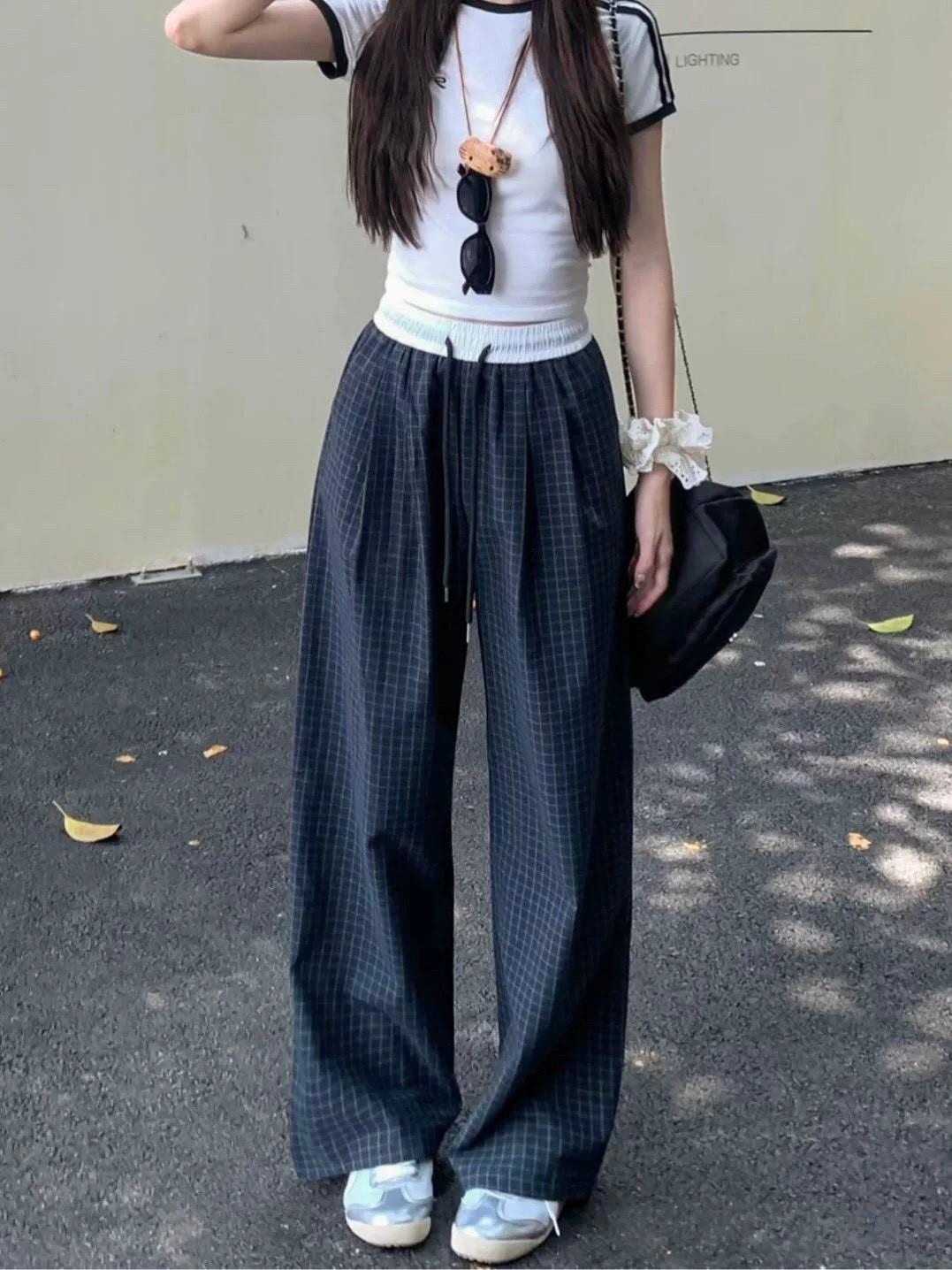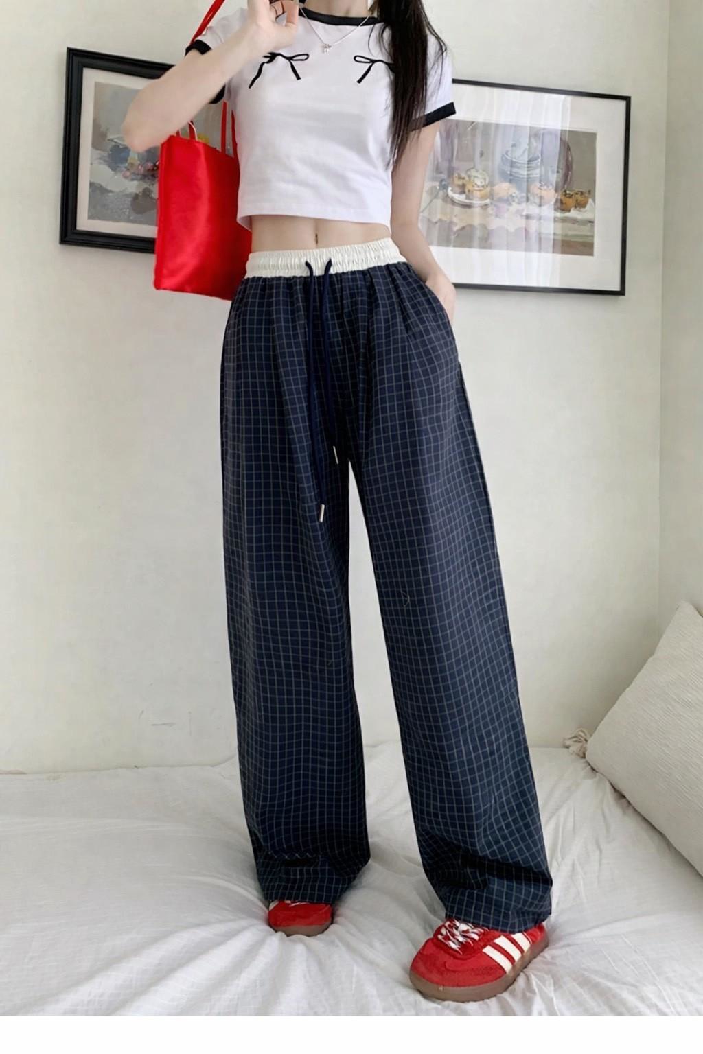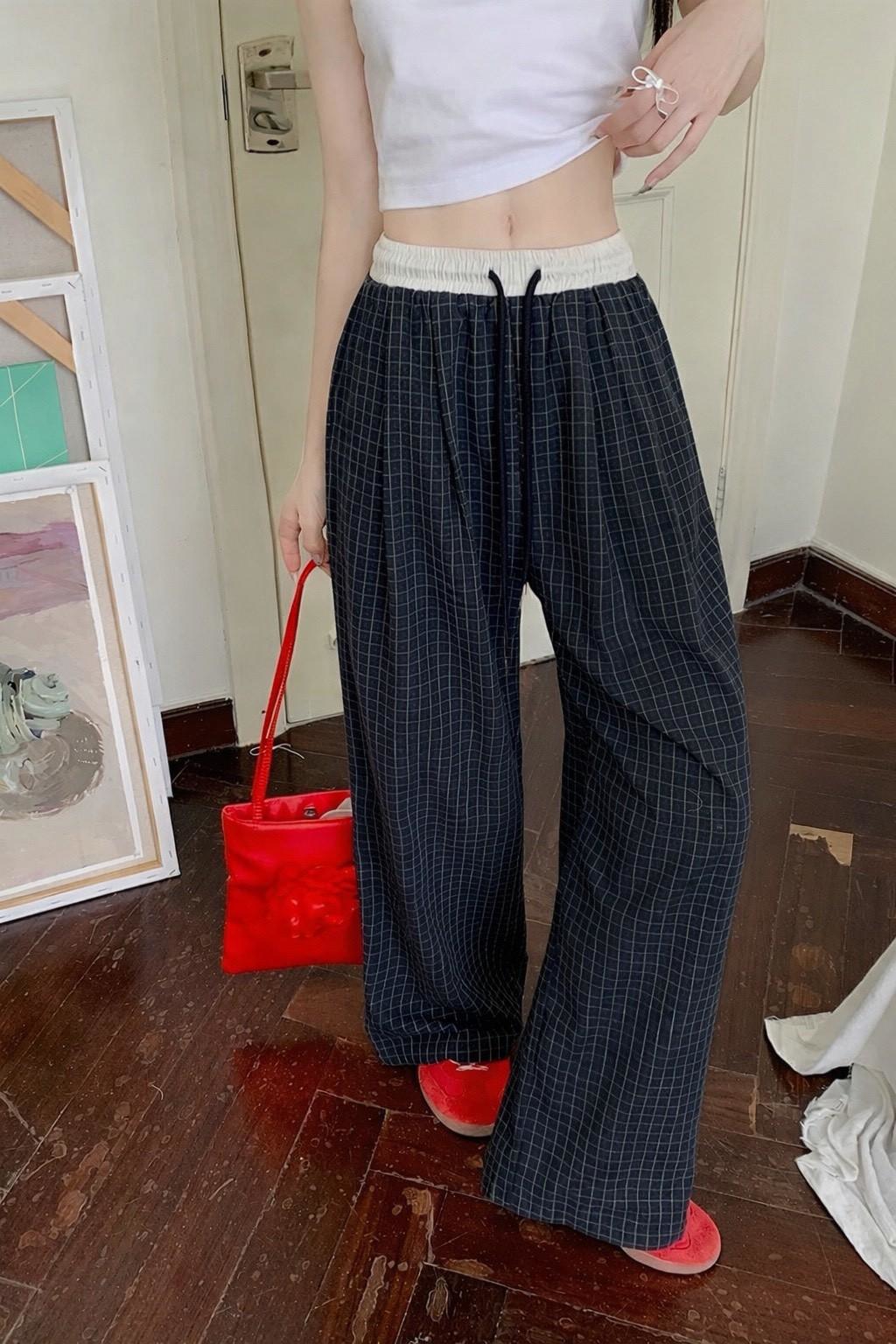 復古慵懶拼接撞色格紋直筒褲 #36270773