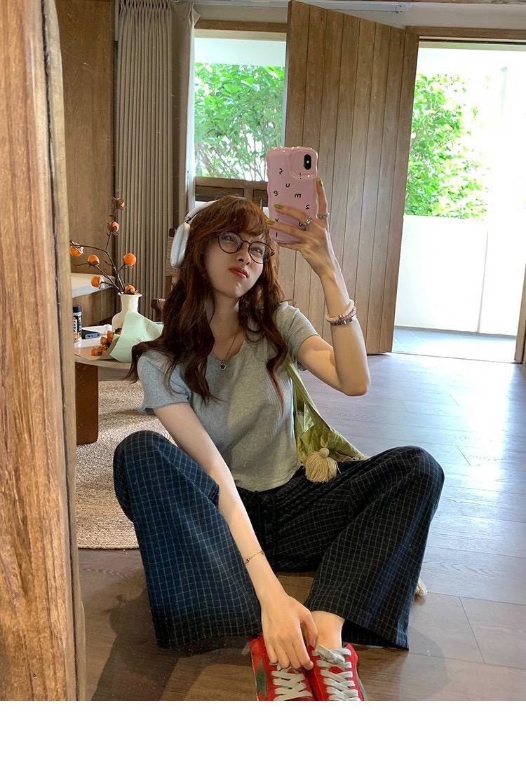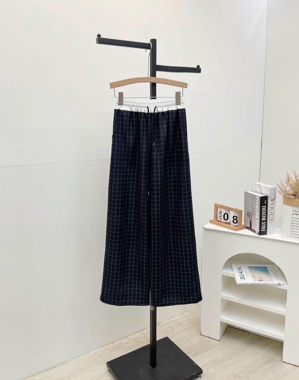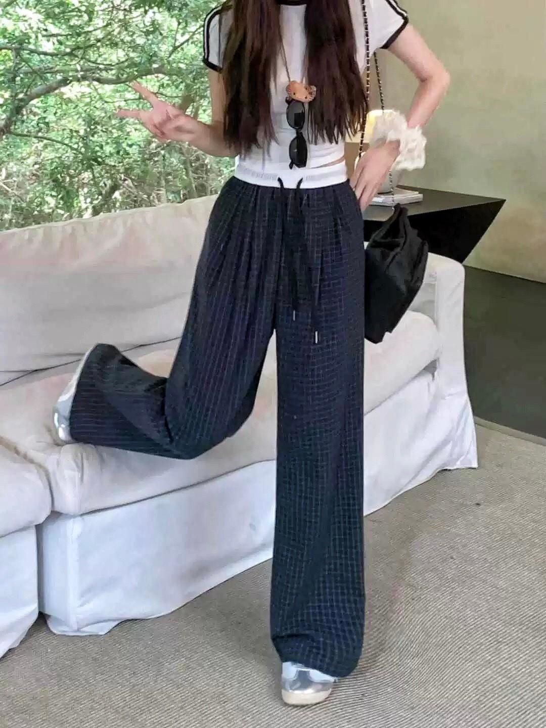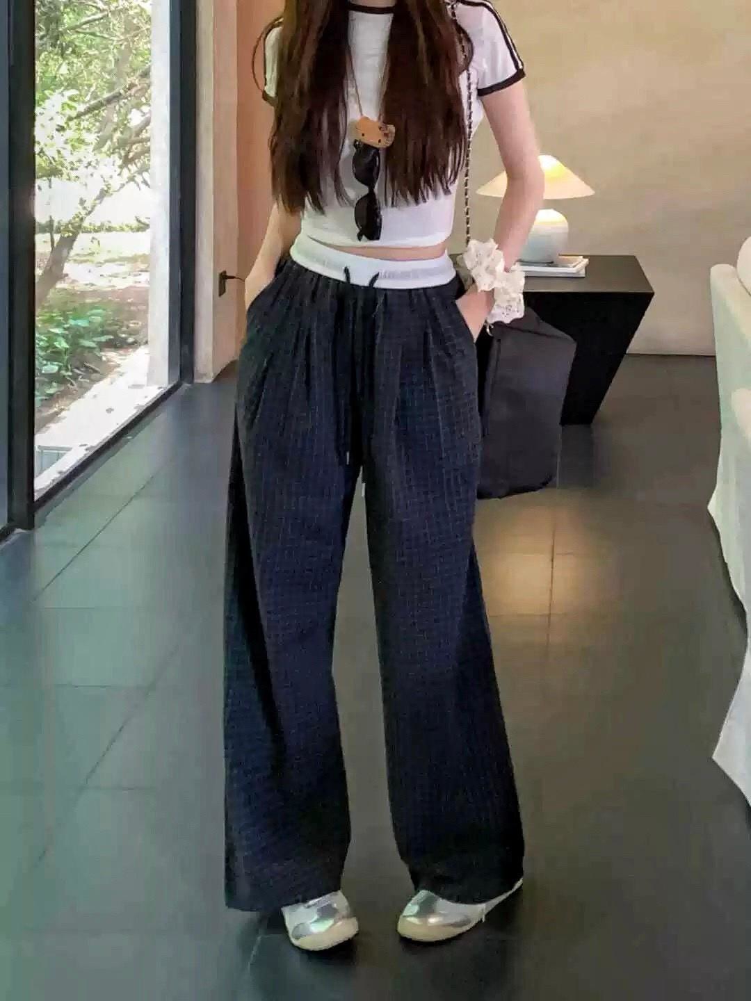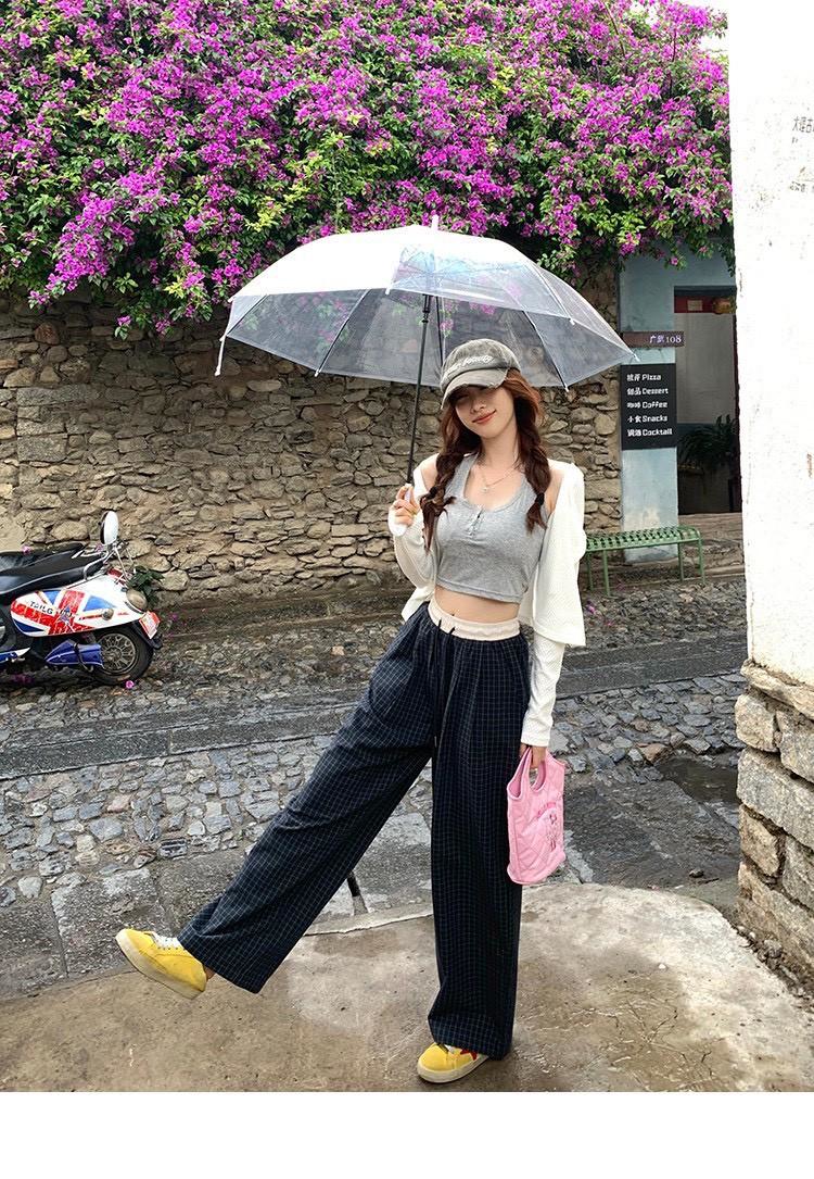 復古慵懶拼接撞色格紋直筒褲 #36270773