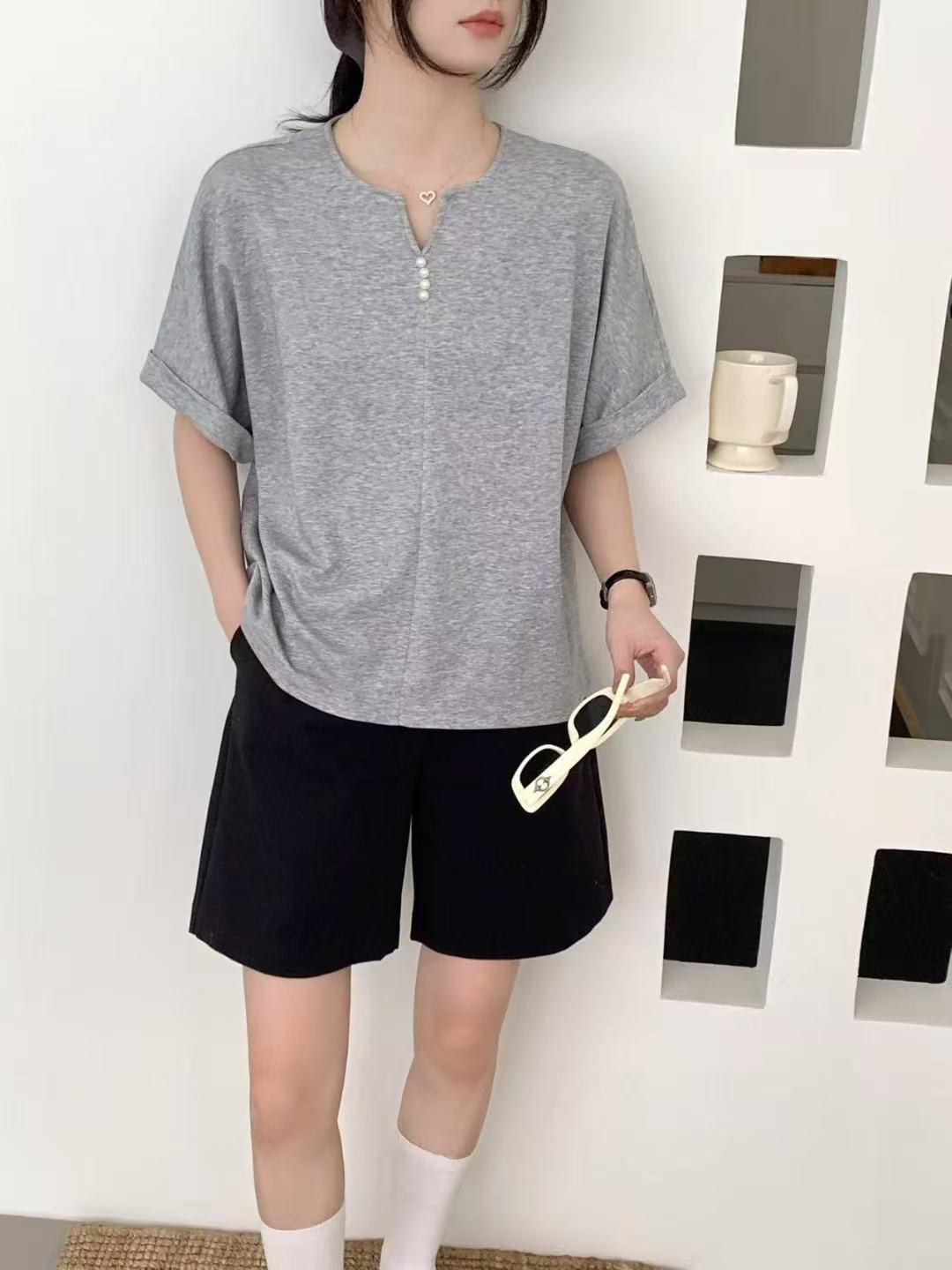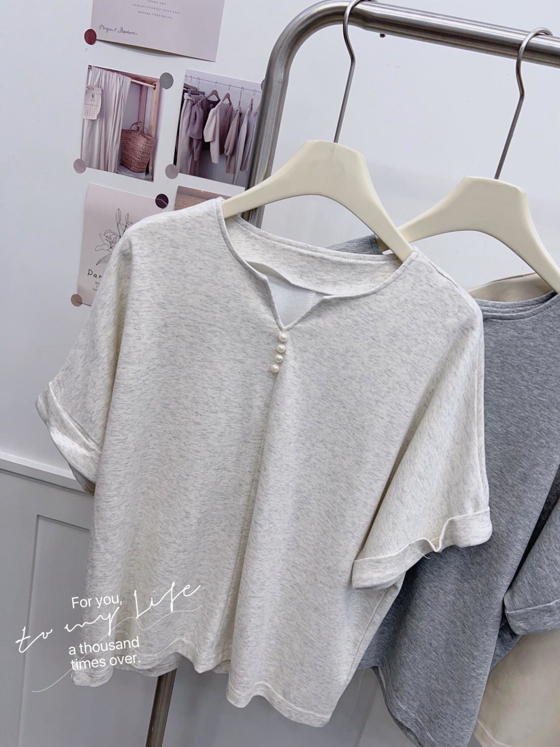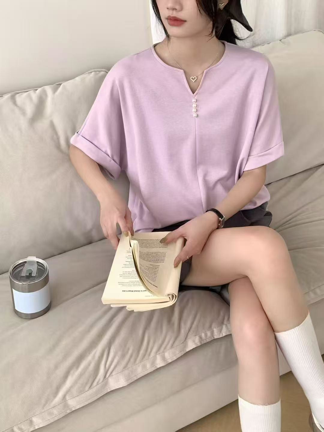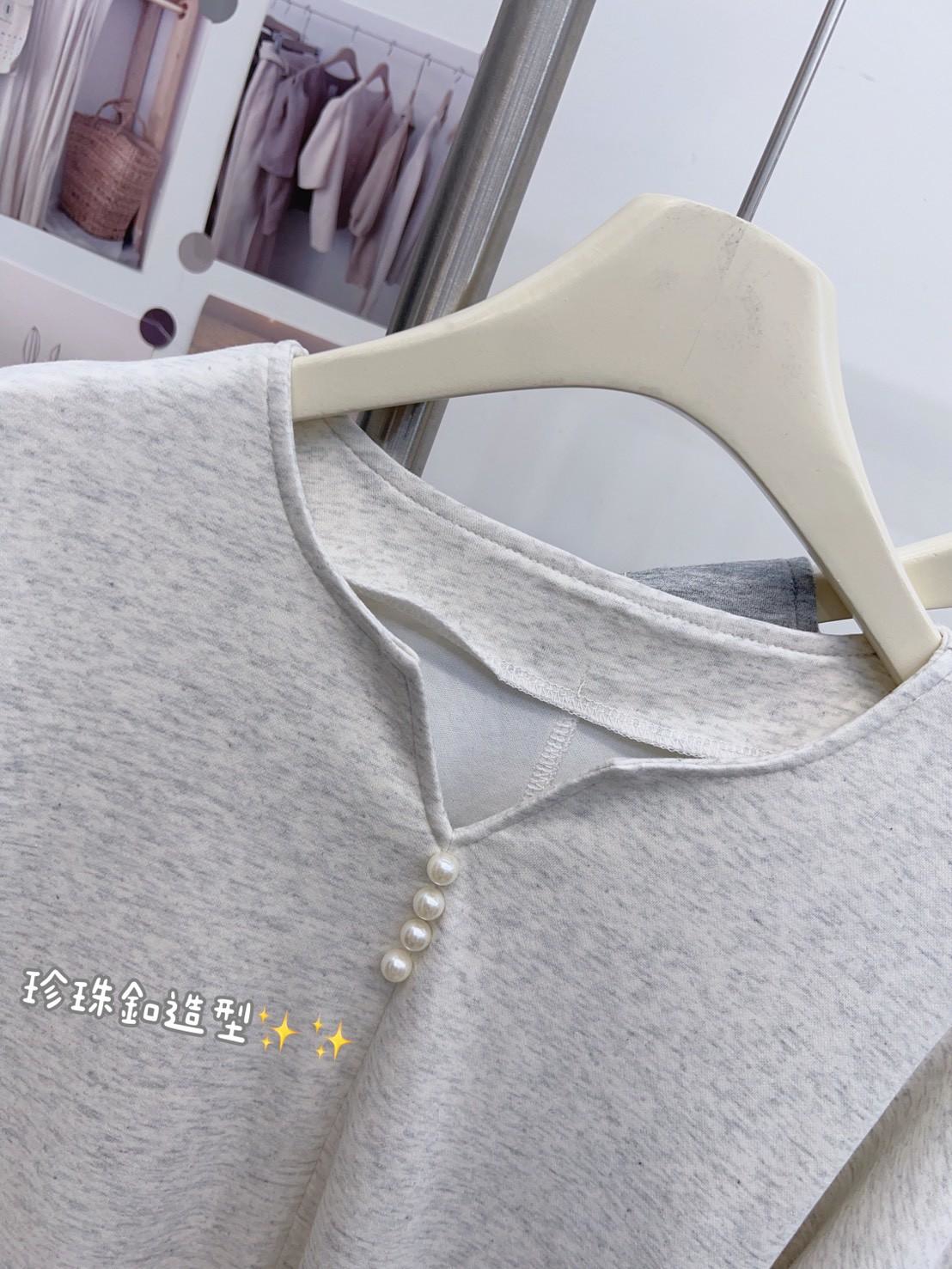 韓系珍珠釦小V領造型太空棉上衣 #36486477