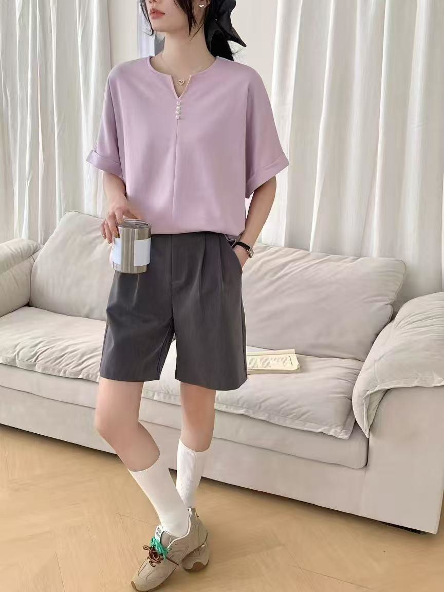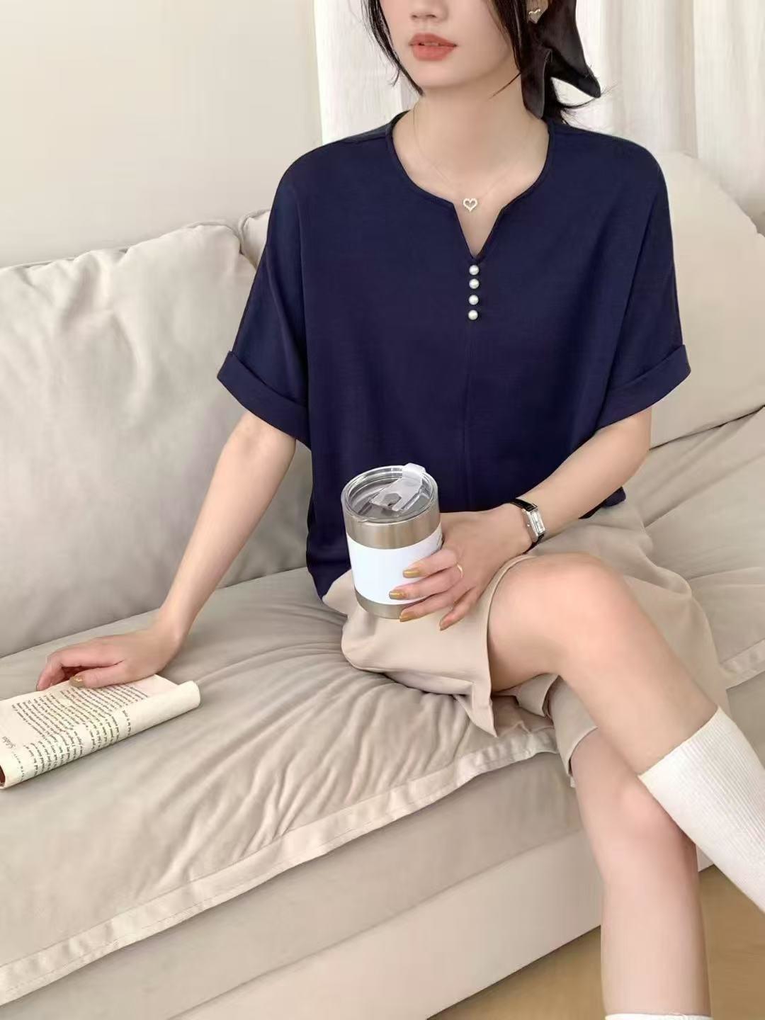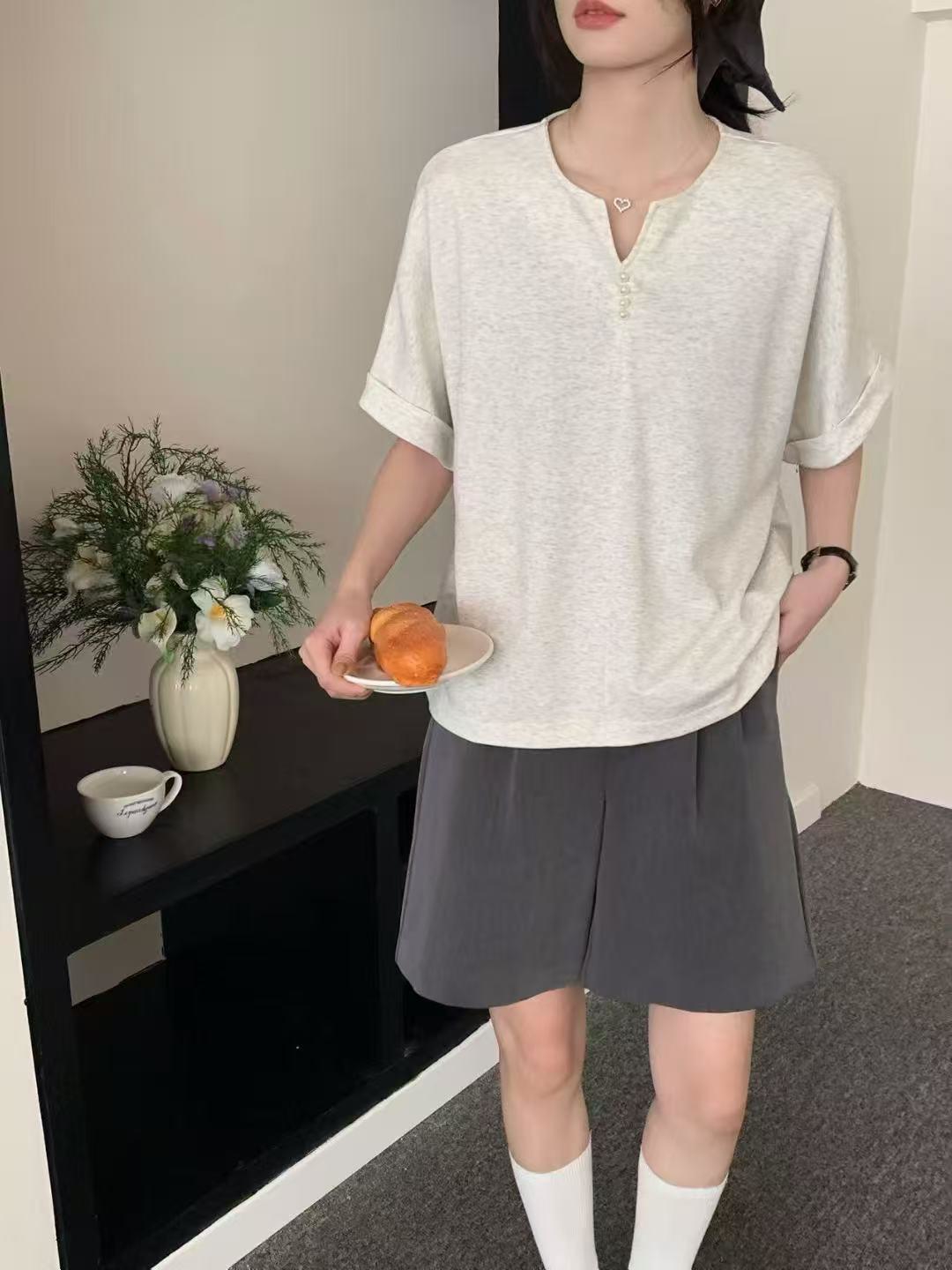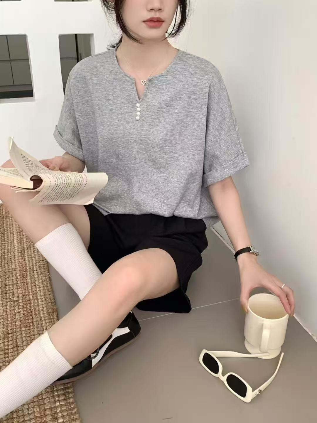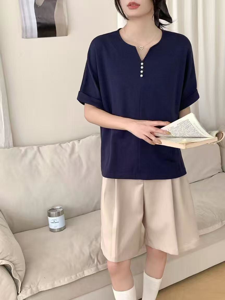 韓系珍珠釦小V領造型太空棉上衣 #36486477