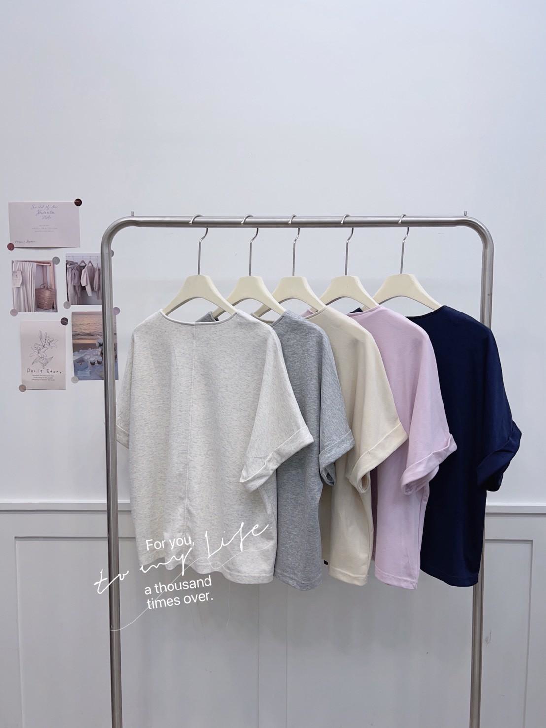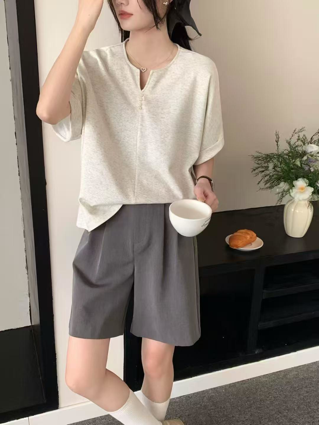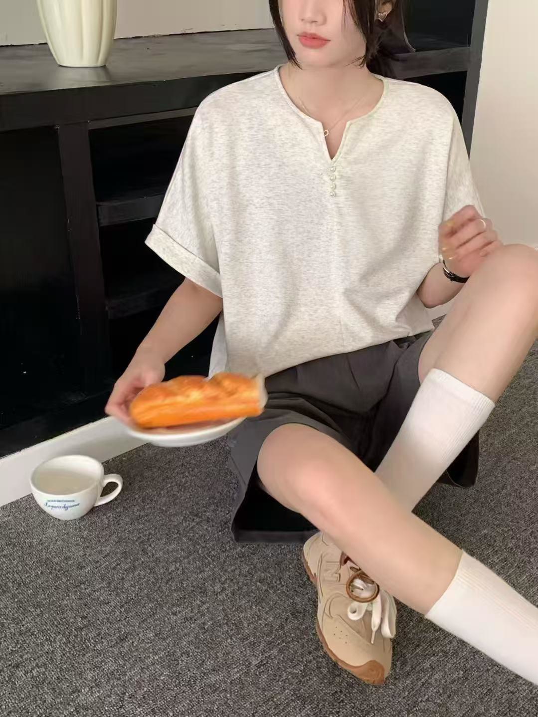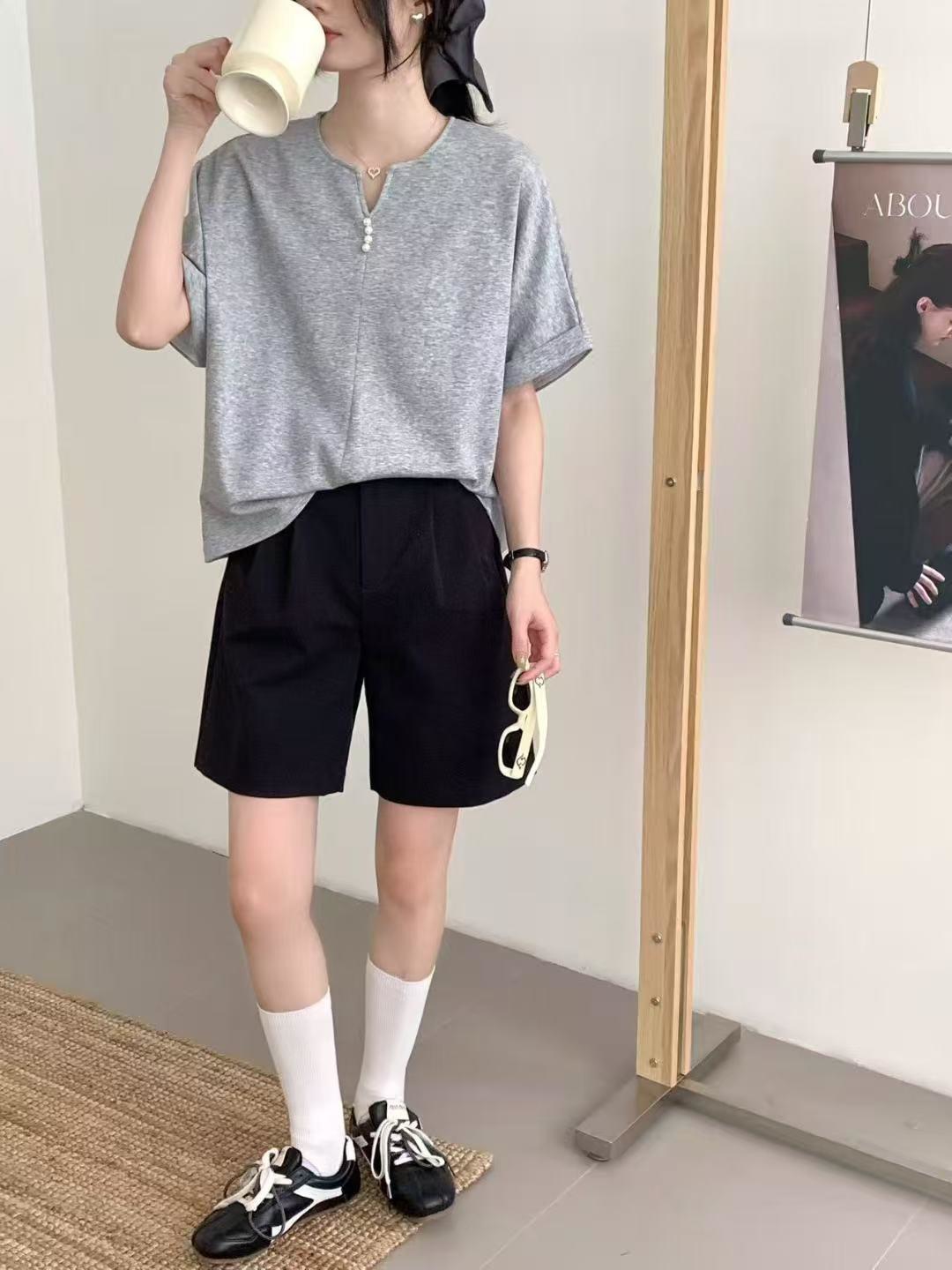 韓系珍珠釦小V領造型太空棉上衣 #36486477